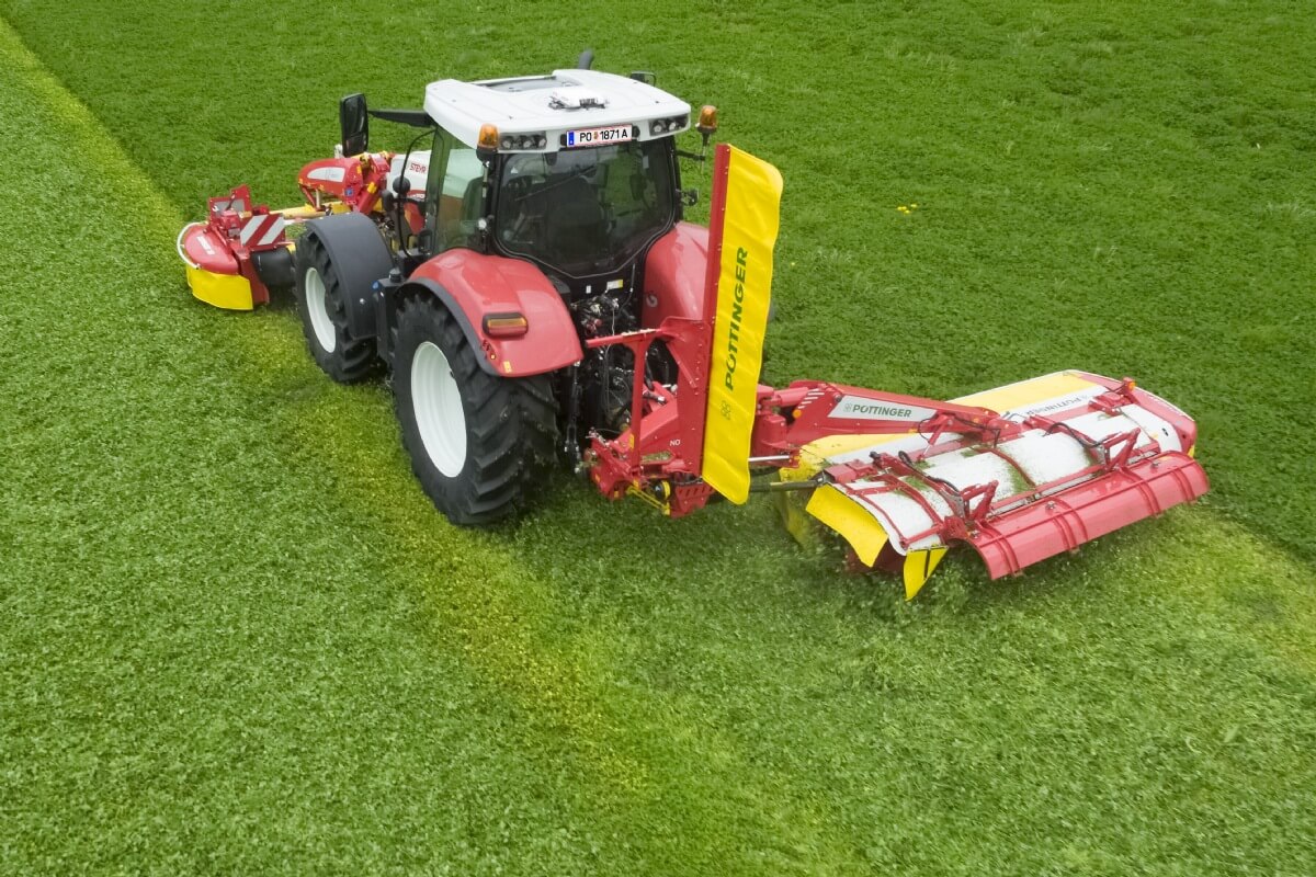 Centre pivot mounting for optimised ground tracking. The NOVACAT centre pivot mounting supports the cutter bar evenly over the entire cutting width. Your mower floats over any ground contour. The mowed crop remains clean and you also save fuel thanks to the reduced power requirement. Due to the uniform cutting height, you benefit from optimum growth and ultimately from higher yields. PÖTTINGER NOVACAT rear mowers can be equipped with swathing discs or a conditioner to meet your individual requirements.