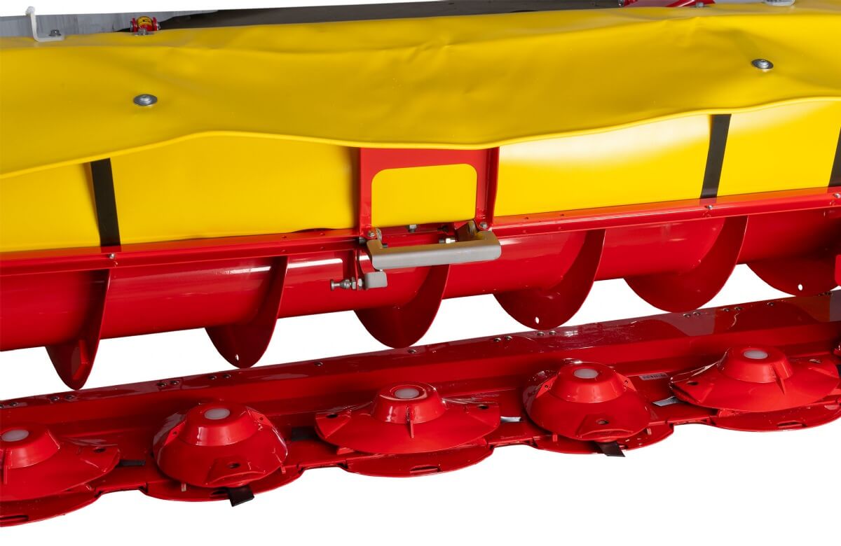 • Swath merging without a conditioner: CROSS FLOW is a cost-effective system for merging swaths. A cross flow auger is integrated in the mower unit to deposit the forage in the way you want it to be: Either merged as a swath or spread over the working width of the rear mower.