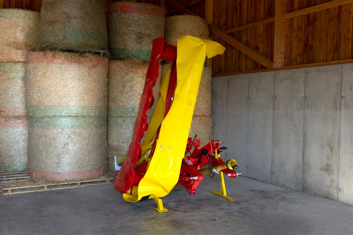 • Safe and practical. The optimised center of gravity of the machine ensures safe and compact road transport. In the transport position, the mower is folded through 102°. This gives you a clear view to the rear through both rear-view mirrors. Using the optional hydraulic folding side guard, you can achieve the lowest possible transport height. With the optional parking stand, your mower can be parked vertically to save space.